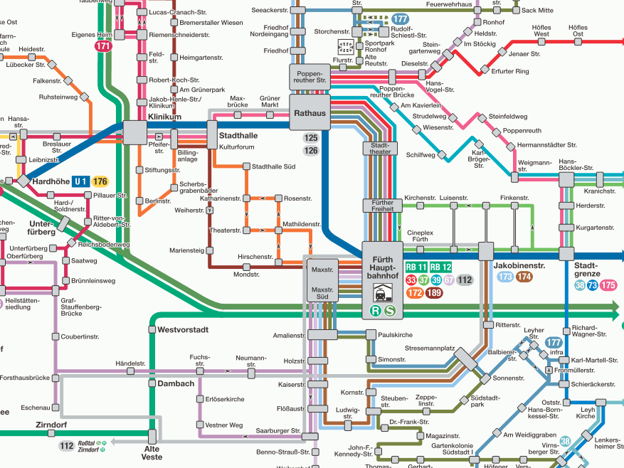 Fahrgäste tun sich vergleichsweise schwer mit der derzeitigen grafischen Abbildung des Linien-Netzes für Nürnberg und Fürth durch die VAG: Der Verlauf einzelner Buslinien lässt sich nicht gut nachvollziehen. Die infra Fürth stellt ihr Linien-Netz bereits seit jeher in vielen unterschiedlichen Farben dar: https://www.vgn.de/liniennetze/